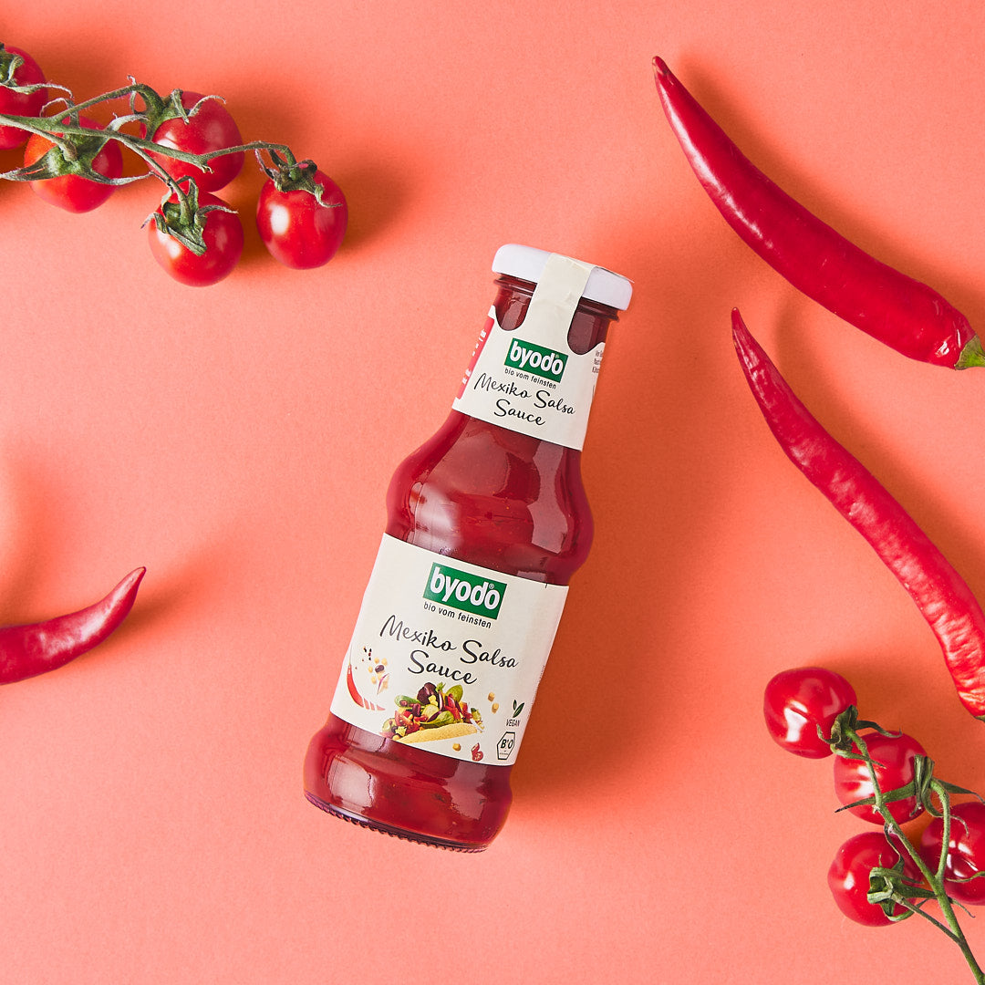 Traditionell passt die Byodo Mexico Salsa Sauce wunderbar zu Tacos, Nachos und sonstigen mexikanischen Gerichten. Als unverzichtbare Grillsauce ist sie der Star an jedem Sommerabend und das aus 100 % feinsten Bio-Zutaten und komplett vegan.