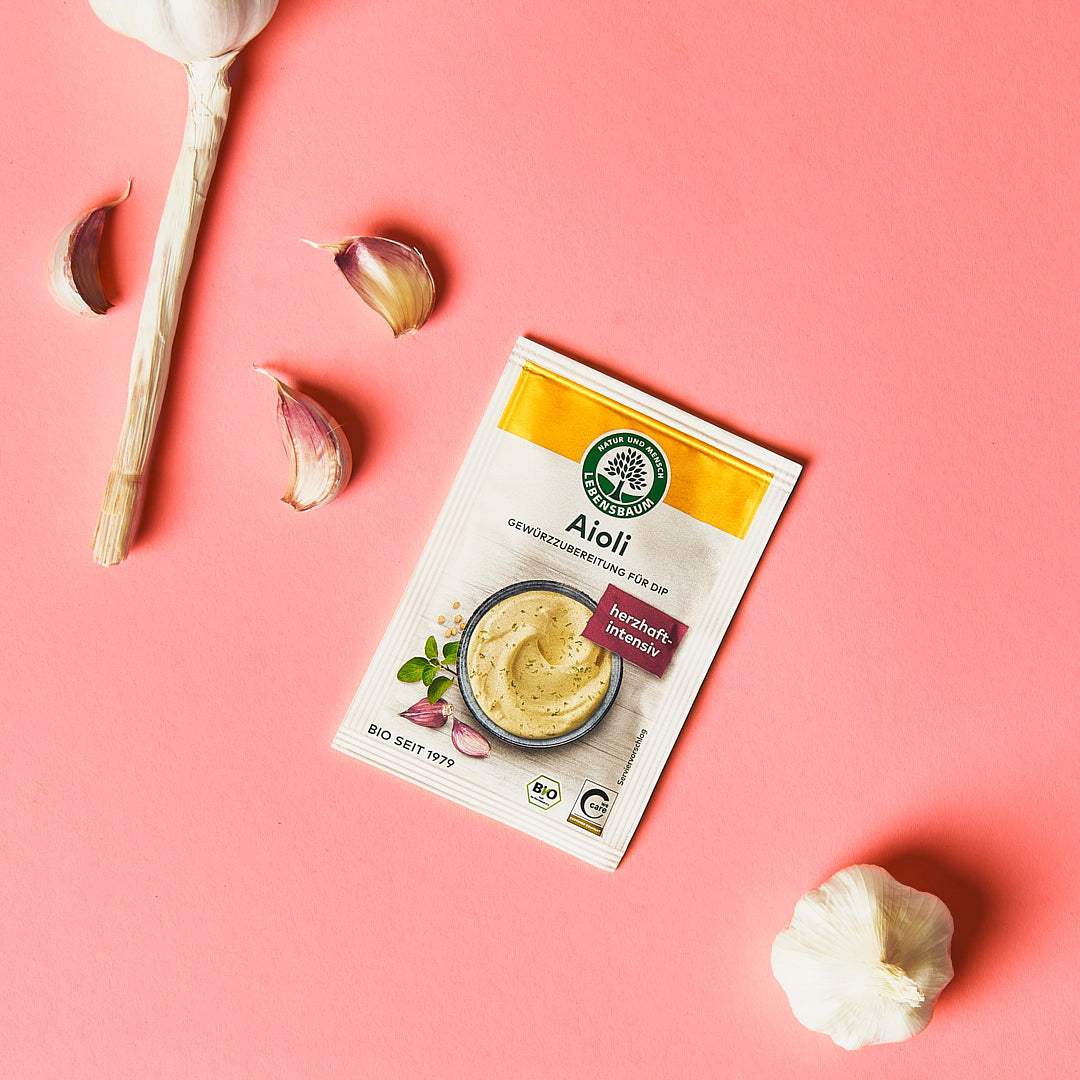 Die neue Bio-Gewürzzubereitung von Lebensbaum enthält alle Zutaten, die Sie für einen leckeren Dip benötigen – und das portionsgenau. Mit wenigen weiteren Komponenten erhalten Sie so in Minutenschnelle pikante Aioli. Dabei ist die Zubereitung sowohl vegan als auch vegetarisch möglich – ganz nach Geschmack.