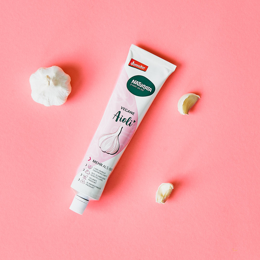 Wenn du Aioli liebst, aber auf tierische Produkte verzichtest, haben wir genau das Richtige für dich: die vegane Aioli von Naturata in Demeter-Qualität. Statt Ei enthält sie Sonnenblumenprotein und ist im Vergleich zur herkömmlichen Mayonaise fett- und kalorienärmer. Und das Beste: sie wird mit Zutaten aus biologisch-dynamischem Anbau zubereitet und trägt das myclimate-Label. So trägst du auch noch was zum Klimaschutz bei!