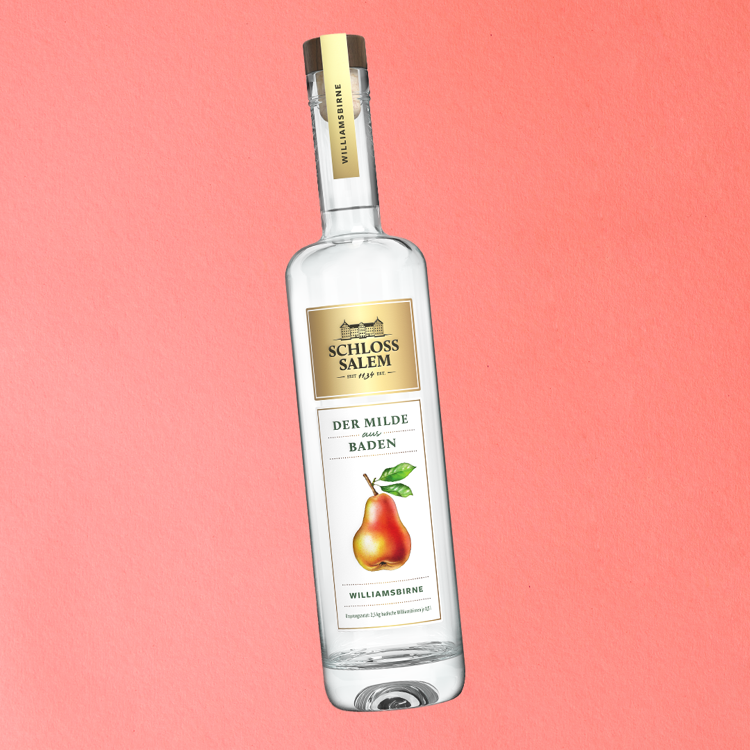 Der Milde aus Baden Williamsbirne aus der Premiuminie von Schloss Salem vereint edlen badischen Williamsbirnenbrand mit mildem Kornbrand zu einem besonders sanften Genuss. Für jede 0,5-l-Flasche werden 2,5 kg badische Williamsbirnen verarbeitet. Mit 30 % vol. überzeugt er durch seine feine Milde – ideal pur als Digestif oder in Longdrinks und Cocktails.