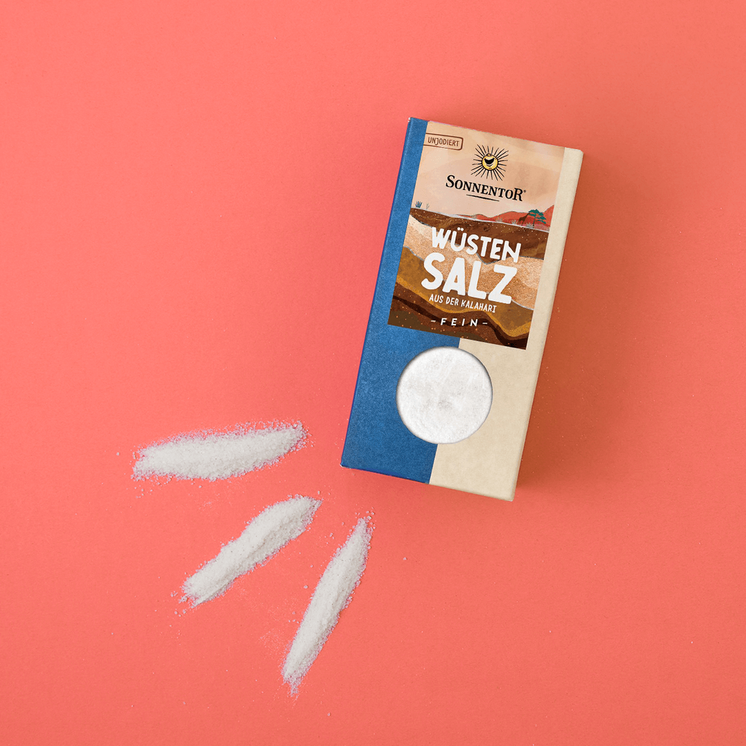 Hier kommt das Kalahari Wüstensalz, es wird per Hand aus über 280 Millionen Jahre alten unterirdischen Sole-Seen in der Kalahari-Wüste gewonnen und anschließend von der Sonne getrocknet. Das Kalahari Wüstensalz steckt voller Mineralien und Spurenelementen.