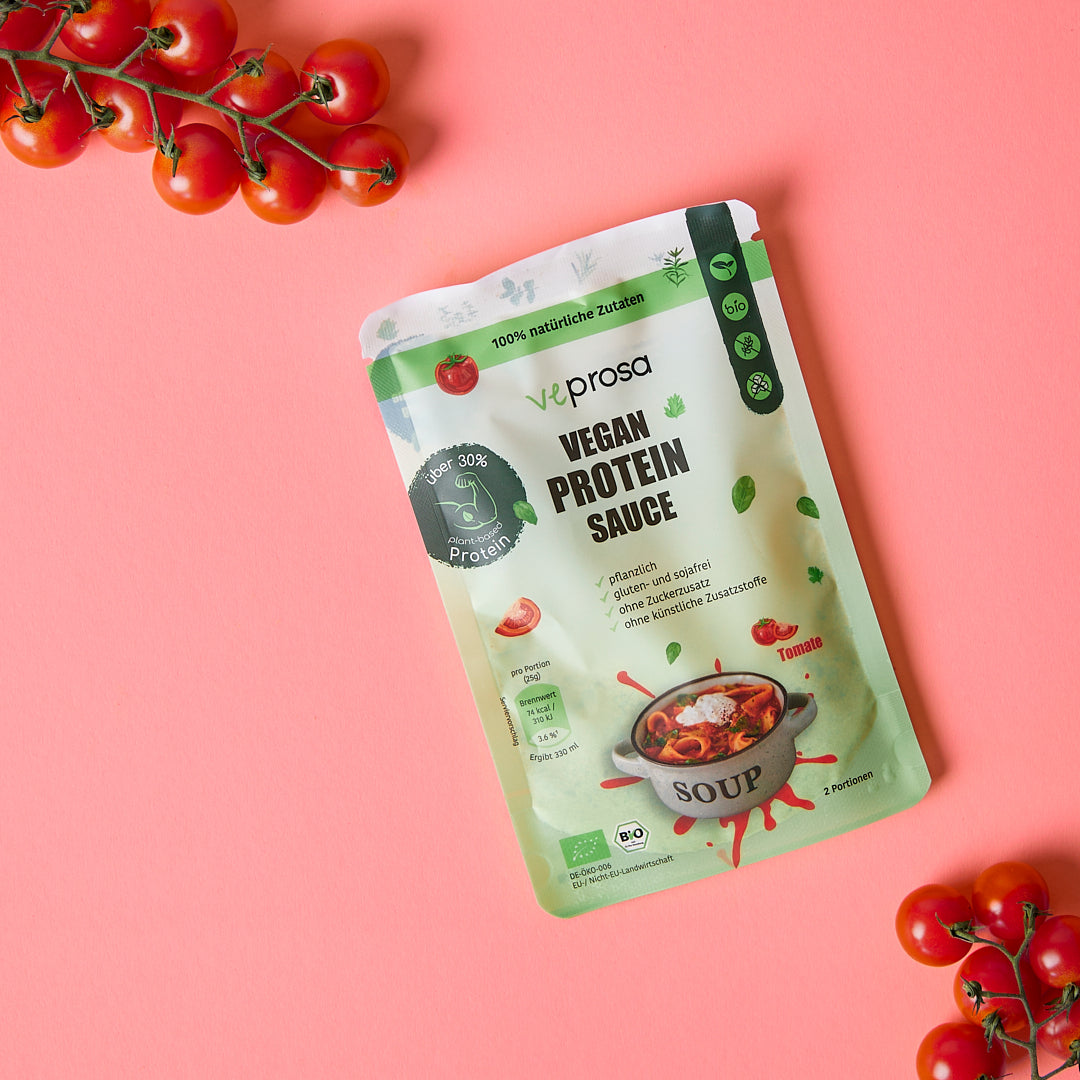 Wie wäre es mit Saucenpulver in der Sorte Tomate mit hohem pflanzlichem Proteingehalt? Einfach mit Wasser anrühren und fertig. Das spart Zeit im Alltag ohne Verzicht auf hochwertige und natürliche Biozutaten. VEPROSA unterstützt dich beim Erreichen deiner Gesundheits- und Fitnessziele und lässt sich kinderleicht in deine Lieblingsgerichte integrieren. Dabei ist veprosa mehr als eine Sauce: Erlebe einen vielseitigen Sattmacher voller Geschmack. Zusätzlich sind unsere Biosaucenpulver glutenfrei und frei von Zuckerzusätzen. Sie bestehen ausschließlich aus Zutaten, die einfach super schmecken. Die Tomatensauce ist dabei die perfekte Ergänzung zu vielen herzhaften Gerichten wie Pasta, Pizza, Lasagne oder Grillsalaten.